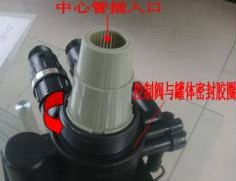 5、將控制器的下布水器口對正中心管,壓下,使中心管插入控制閥承插口中,小心地沿順時針方向轉動控制器,(注意:安裝控制閥的過程中,一定要確保中心管插入閥體)直至控制閥旋緊在罐體接口上。控制器與罐體之間是由控制器配戴的橡膠圈密封的,不要在控制器螺紋上纏繞其他密封材料。